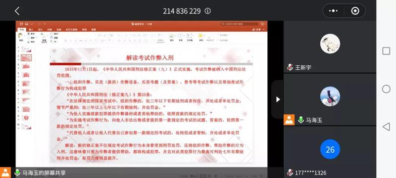 “文以行为本,在先诚其中”,期末考试周即将来临。为严肃考风、考纪,树立良好学风为,营造浓厚的期末复习备考氛围,使同学们严格遵守考试规章制度,坚持实事求是的原则,2020年12月19日,星空平台app地址开展了诚信考试主题教育活动。参加本次活动的有团委书记张亚昂老师以及全体大一学生。其中201班和204班线下进行,202班线上进行。