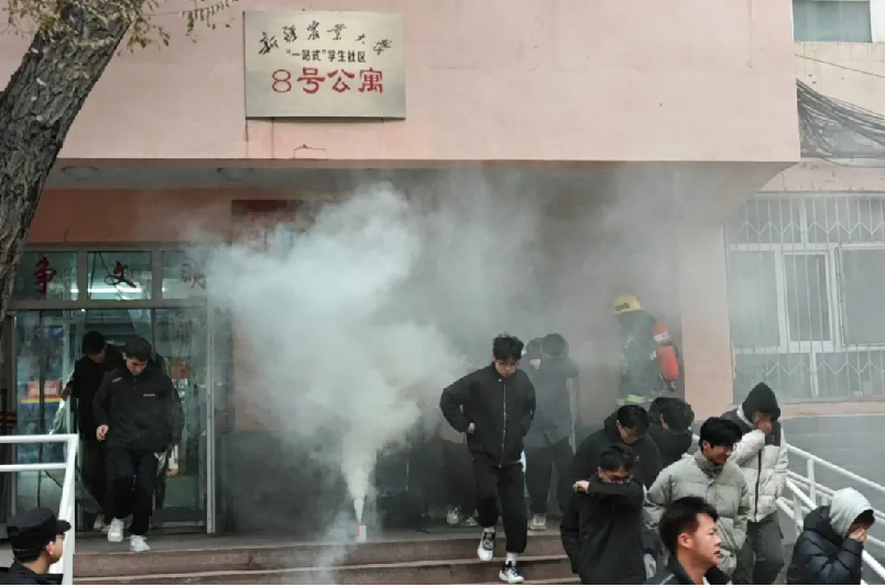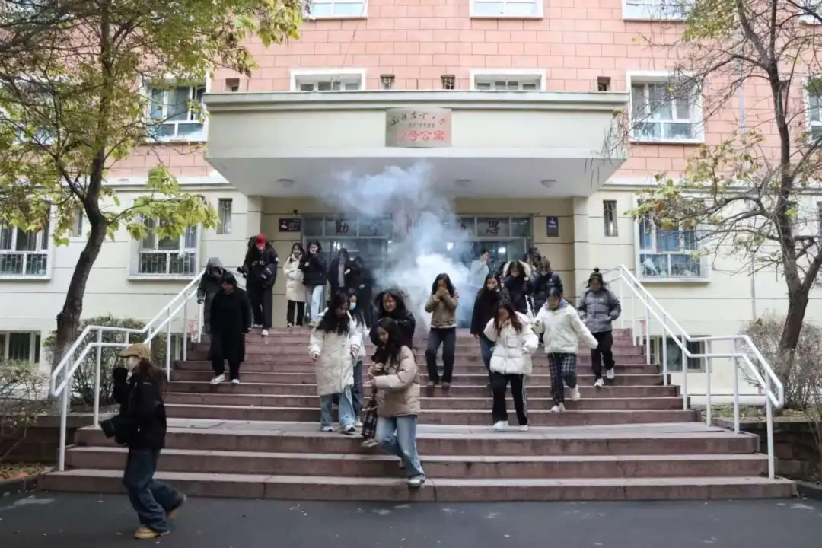 演练伊始,警报声突然划破校园宁静。宿舍内的师生们闻声而动,迅速按照预定疏散路线,用湿毛巾捂住口鼻,弯腰低姿沿着墙根快速有序地向楼下安全区域疏散。整个过程紧张而有序,充分展现了师生们在紧急情况下的良好纪律性和协调配合能力。